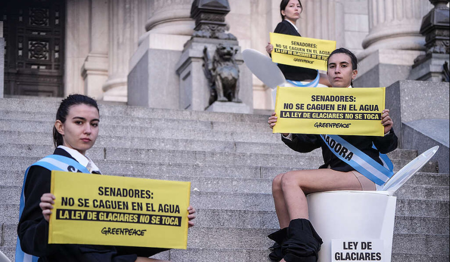 La protesta se realizó horas antes del debate en el Senado de la Nación Argentina, donde se busca avanzar con la reforma de la Ley de Glaciares, una norma vigente desde 2010 que protege los glaciares y el ambiente periglaciar como reservas estratégicas de agua dulce.